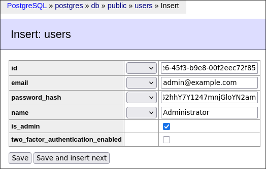 Tick is_admin and enter arbitrary values into name and email (albeit email needs to be a valid email address). Then enter a random UUID into uuid (for example be652059-06a8-4eb7-ad4b-87cb1bd2b258) and your password's hash into password_hash. It can be quickly generated here. We're using 12 salting rounds. At the end you should have something like this: