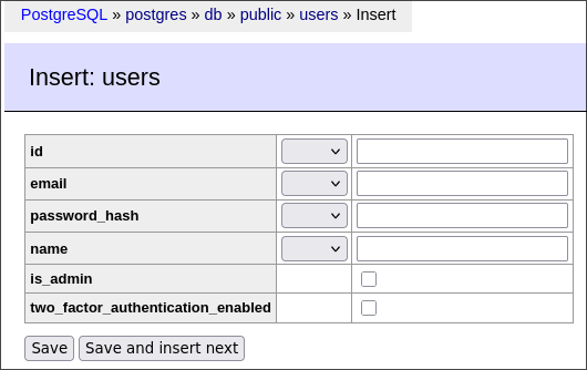 To fully use the website, you'll need an admin user. You can easily add one via database UI. Visit localhost:3001, and navigate to the users table > "New item". You'll see something like this: